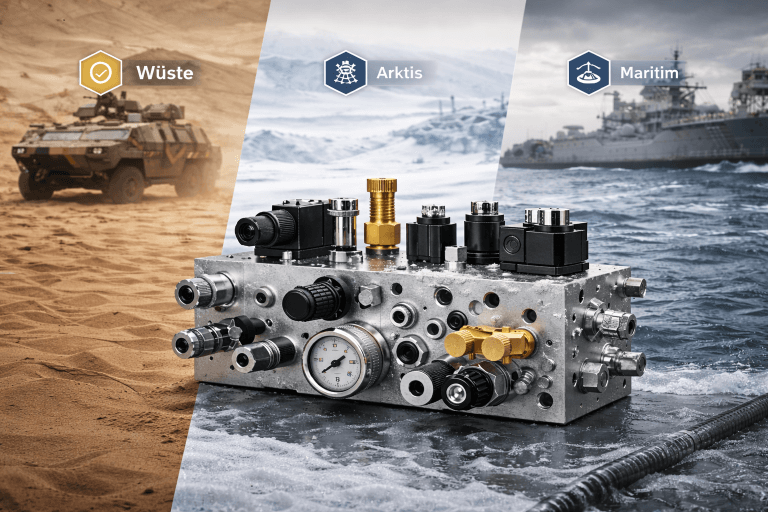 Militärische Systeme müssen weltweit funktionieren – in Wüstenregionen, arktischen Klimazonen oder maritimer Umgebung. Entsprechend werden die Ventilblöcke strömungsoptimiert konstruiert, auf minimale interne Leckage ausgelegt sowie umfassend geprüft und dokumentiert. Die Kombination aus präziser Konstruktion und qualitativ hochwertigen Ventilen stellt sicher, dass die hydraulische Steuerung auch unter Extrembedingungen zuverlässig arbeitet.