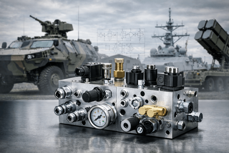 Hydraulische Systeme in der Rüstungsindustrie unterliegen extremen Anforderungen an Präzision, Belastbarkeit und Ausfallsicherheit. Ob in gepanzerten Fahrzeugen, Marinesystemen, stationären Verteidigungsanlagen oder spezialisierten Logistiklösungen – die zuverlässige Steuerung hydraulischer Funktionen ist sicherheitskritisch. Im Zentrum dieser Systeme stehen individuell entwickelte Steuerblöcke.